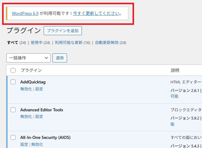 そして、WordPressのダッシュボードを開くと「WordPress 6.9 が利用可能です!今すぐ更新してください」というお馴染みの警告が表示されています。(自動アップデートを設定してある場合を除く)