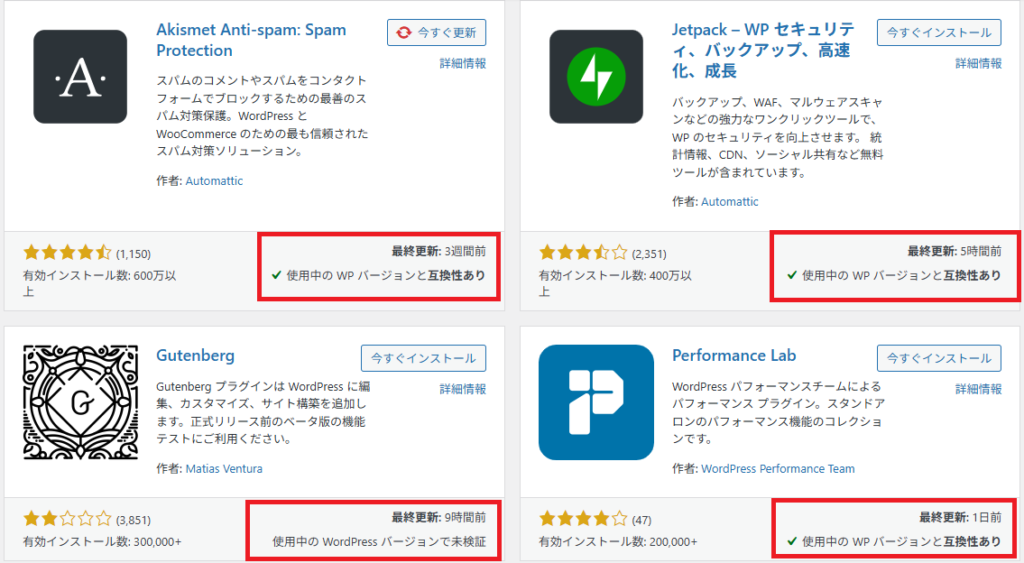 「使用中のWordPressバージョンで未検証」となっている場合は、アップデートを急がずに様子を見ることが正解です。