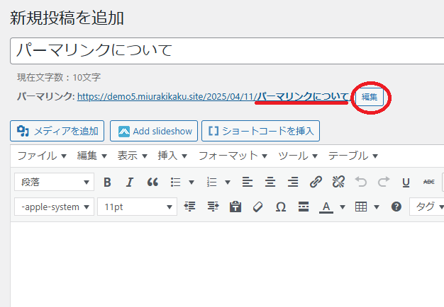 パーマリンク箇所の右側に「編集」ボタンがありますので、クリックします。