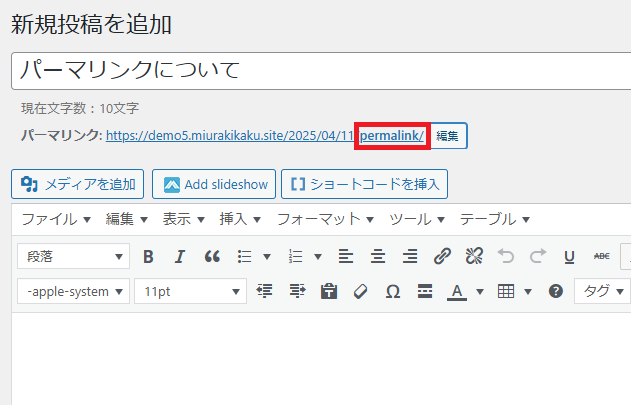 今回は「パーマリンクについて」という記事タイトルですから、「permalink」としてあります。